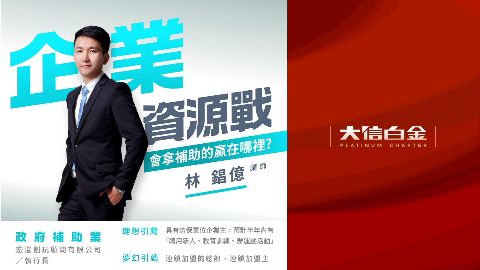 林錩億講師,長期協助企業申請政府補助與資源整合,熟悉各類補助計畫與申請邏輯。